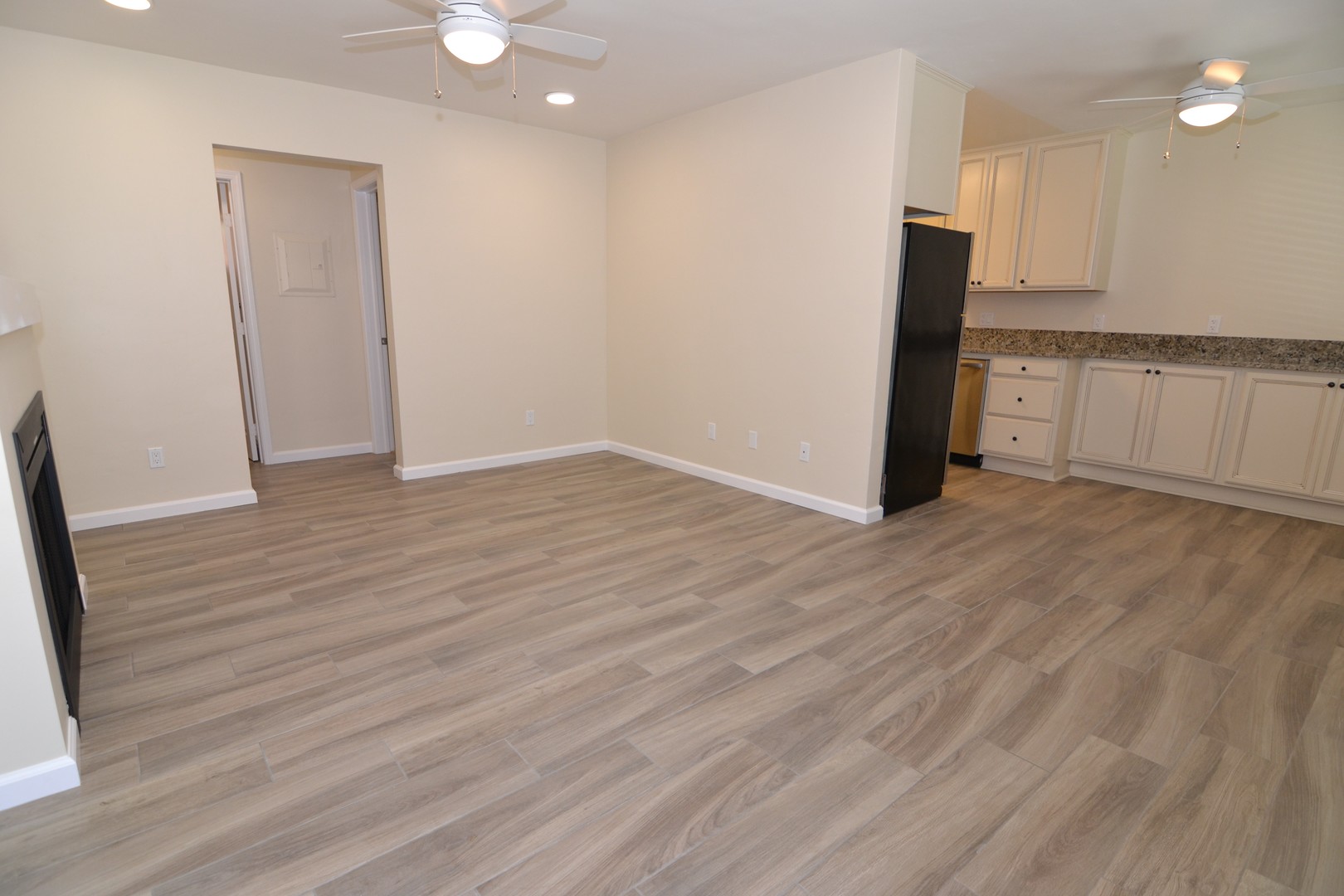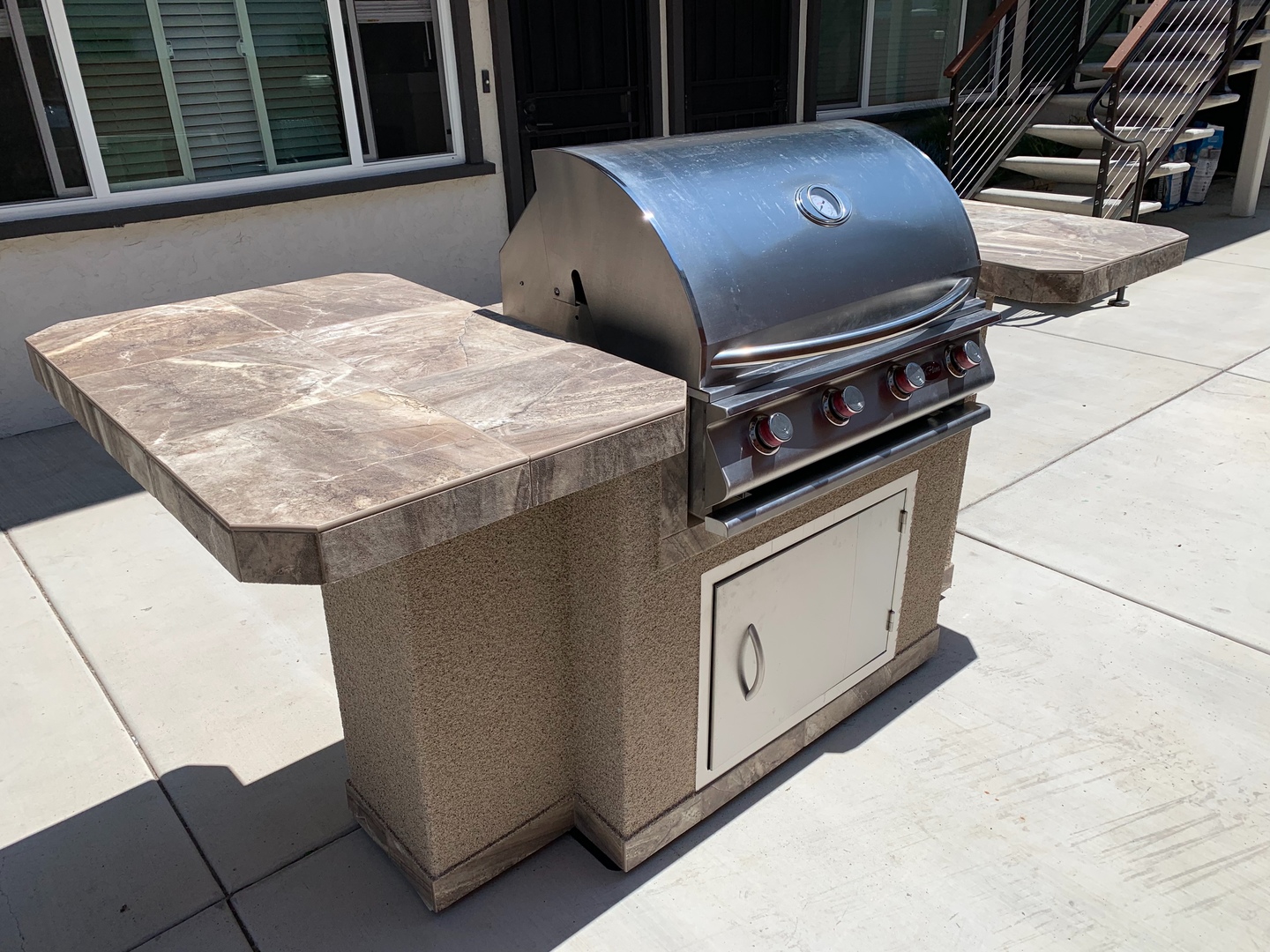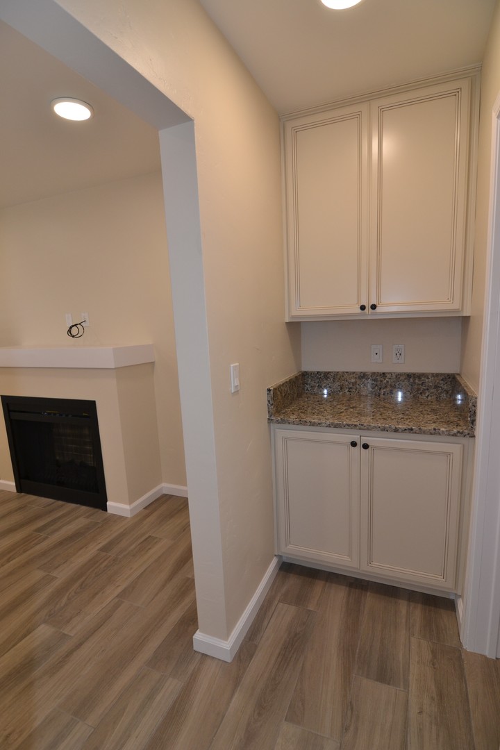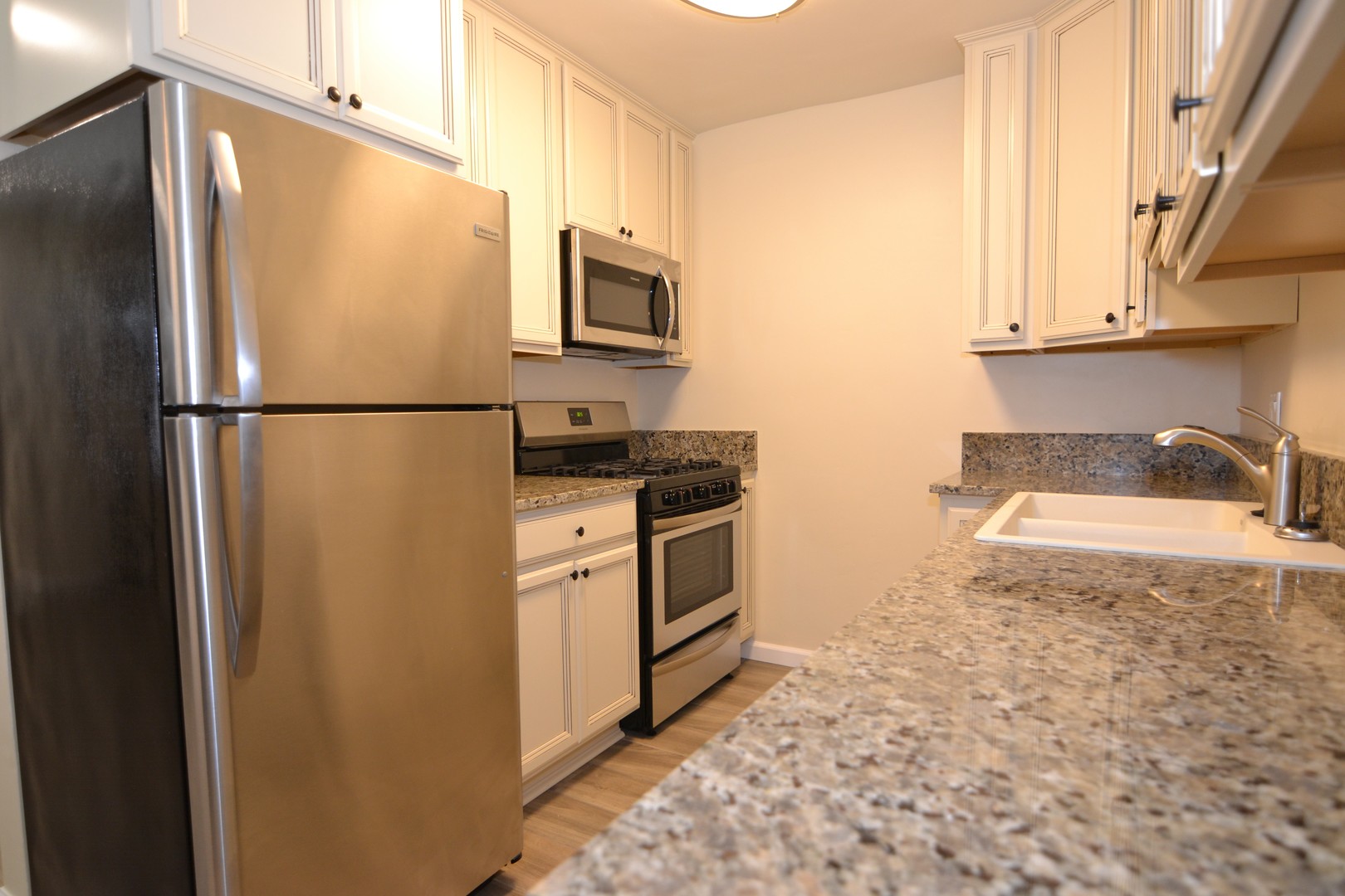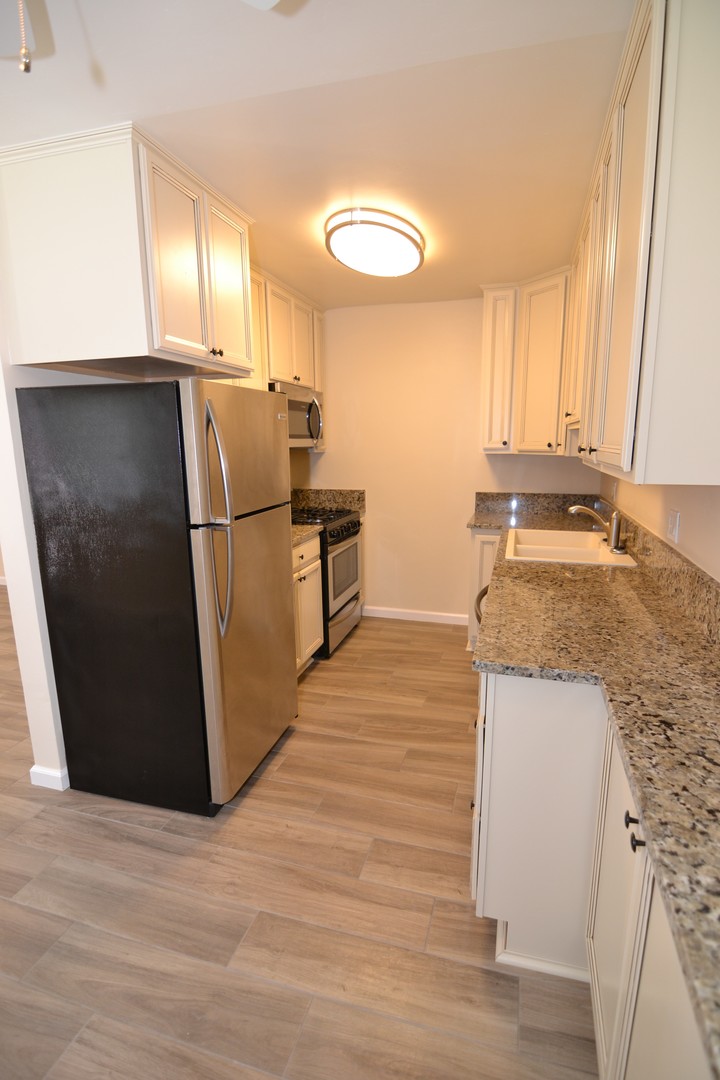 -Kitchen: cabinets, counters, and tile flooring. Stainless steel appliances (refrigerator with ice maker, range, microwave, and dishwasher)